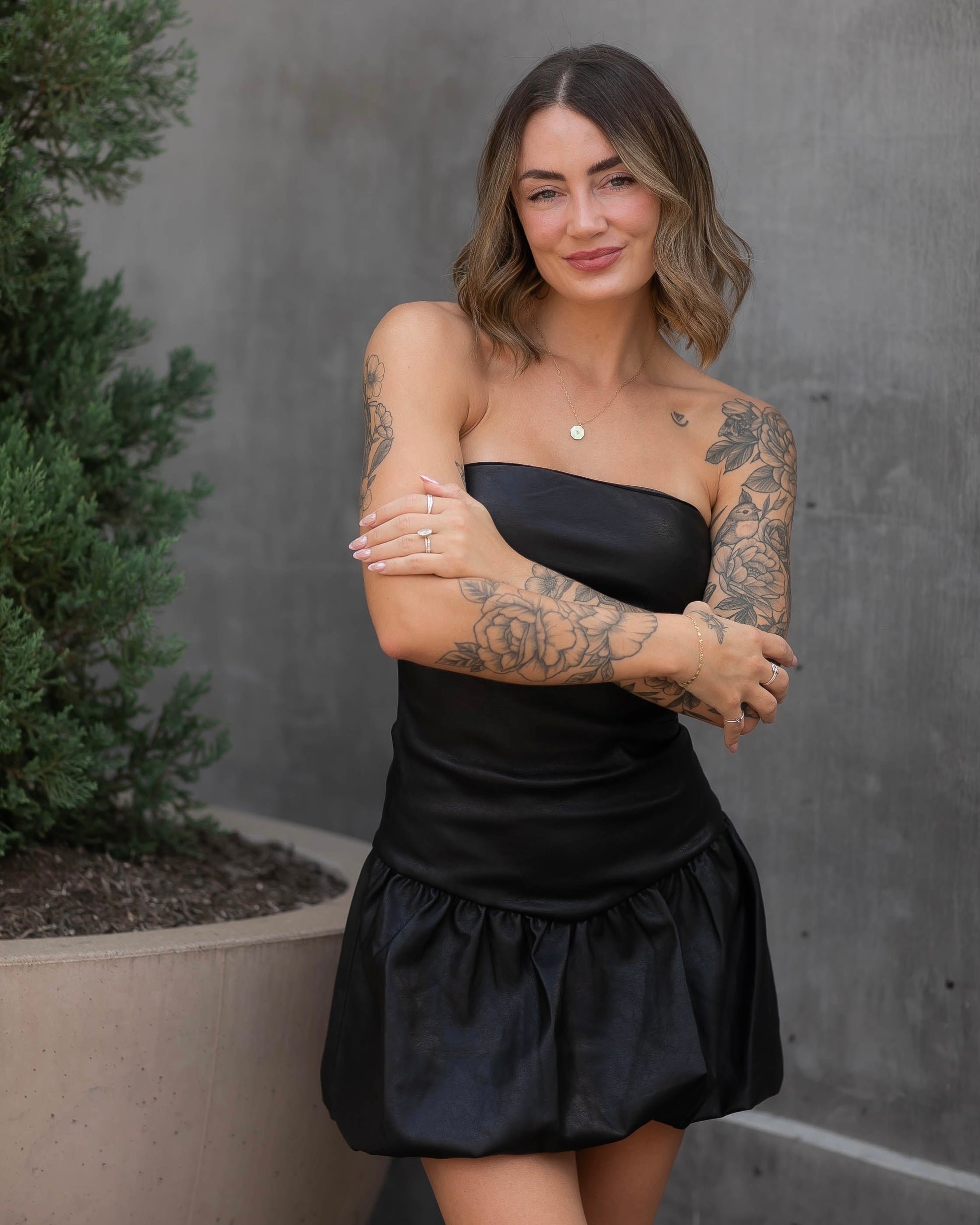 Our Avant Garde Mini Dress is giving a little bit sugar (with its bubble hem cute detail) and a little bit spice (with its tube top and black vegan leather look). We love this look paired with some black kitten heels.