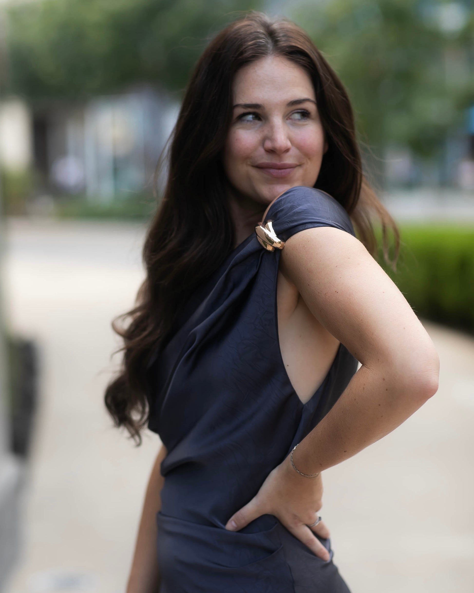 Our Elegance Off the Shoulder Dress is a navy/gray color and midi length. One strap lays on top of the shoulder, and the other lays to the side, off the shoulder, to give that trendy, asymmetrical style. We love the gold detail at the shoulder that adds a little statement; this dress is just perfect for your upcoming evening events.