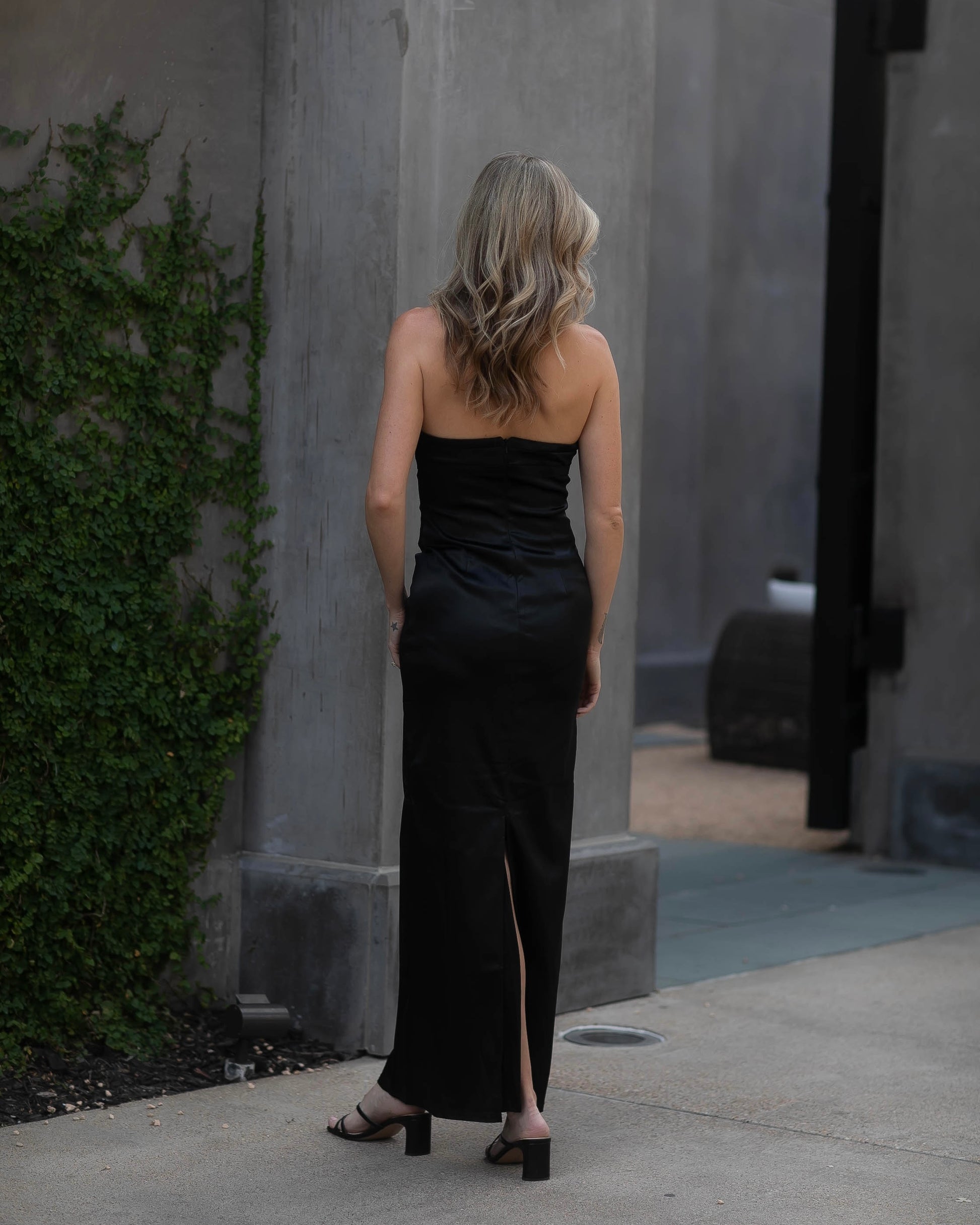 Our Tres Chic Black Dress is a midi to full length dress depending on the wearer’s height! She has a straight silhouette with a silky-like feeling and bows that line the bodice that we just adore.